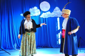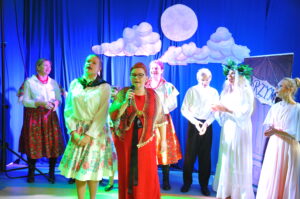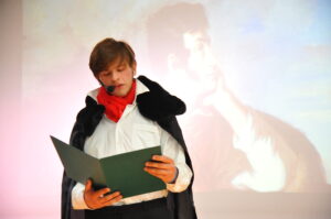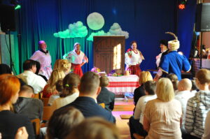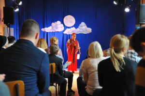 Po części oficjalnej rozpoczęła się część artystyczna… „200 lat temu w Wilnie zostały wydane Ballady i romanse Adama Mickiewicza- zbiór poezji, który zapoczątkował w Polsce romantyzm (…) Niech Ballady i romanse ponownie odkryją przed nami swoją wybitną wartość literacką, cenny wymiar moralny i bogactwo kulturowe Rzeczypospolitej, stając się dal wszystkich prawdziwie twórczą inspiracją do zrealizowania własnych, oryginalnych odsłon Narodowego Czytania 2022”- czytamy we fragmencie listu Prezydenta Rzeczypospolitej Polskiej- Andrzeja Dudy do rodaków. Także do nas- do Zespołu Niepublicznych Placówek Oświatowych, z okazji obchodów Dnia Edukacji Narodowej zawitała twórczość Wielkiego Wieszcza. W muzycznej, poetyckiej i teatralnej odsłonie w wykonaniu uczniów i nauczycieli mogliśmy zachwycić się i na nowo przeżyć mickiewiczowskie strofy.